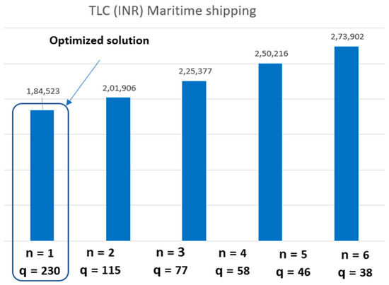 As U and L are constants, from Equations (13)–(15), it is clear that the transportation cost formula for the sea also has only two variables named shipment size (q) and number of shipments (n) in the considered time horizon for a particular product. All the variables considered in Equation (9) for TLC are constants for a particular product and company, except the shipment size (q) and number of shipments (n) in a particular time horizon; hence, to minimize the TLC, we have to optimize the decision variables, which are shipment size (q) and a number of shipments (n).