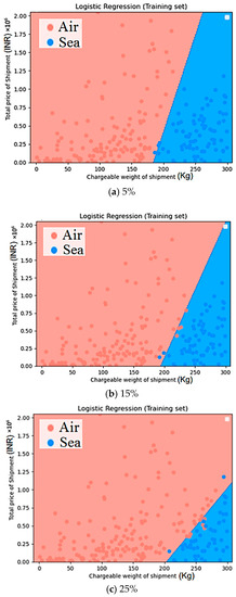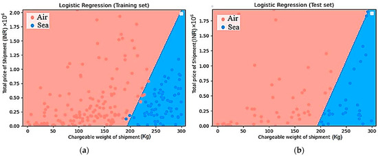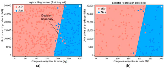 Accuracy scores and form of decision boundary for various machine-learning classifiers were compared to select an ideal classifier using Table 4. Linear models performed better than other non-linear models. The best result was obtained using a logistics regression classifier. The decision boundary for logistic regression is plotted in the scatter plot shown in Figure 7. The training and test set classification results for various classifiers, which might be important for answering the importance of linear solver selection, are stated in Appendix A. The confusion matrix for logistic regression is shown as a confusion matrix in Table 5. Figure 7a indicates the scatter plot for the training set, while Figure 7b is for the test set. It is evident from the graphs in Figure 7 that we can establish a chargeable threshold weight as per unit price of the product, below which all the shipments of that product could be brought by air freight and above which all the shipments will be brought by sea freight to obtain the minimum TLC., e.g., for a product pricing 10,000, coming from Germany, the threshold chargeable weight for air is ~200 Kg, as evident from Figure 7a, i.e., all the shipments with chargeable weight for air, above 200 Kg, should be preferred to come via sea to reduce the TLC. The slope of the decision boundary is positive, indicating that as the unit price of the product goes up, the threshold for the chargeable weight also goes up; this is because a higher price of the product and longer lead times for maritime transport increases the inventory holding costs to significantly higher levels as compared to air, where lead times are low. The high-value products carried for long as an inventory constitutes lost capital for more time, increasing the inventory holding costs. This suggests as the products get costlier, more and more of them are preferred to go by air, which allows inventory holding costs to reduce, which in turn reduces TLC. This framework allows the user to decide the freight mode irrespective of the shipment size, which could be very beneficial to broadly classify the products into categories irrespective of their varying demands.