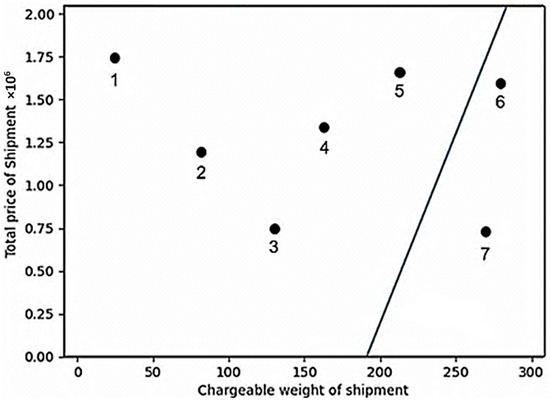 A similar study considered the “Total price of the shipment” rather than the “Unit price of the product” shipped. This second framework considers the total price of shipment; therefore, it takes into account the unit price as well as shipment size, yielding more accurate results. Three hundred data points were generated, with 25% data used for testing. The top five rows for the data are shown in Table 6.