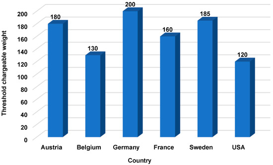 To understand the concept of threshold weight, we will consider a shipment where the chargeable weight for air mode, as well as sea mode, is the actual weight of the shipment in kg. The plots of the chargeable weight for such a case against TLC are shown in Figure 10. These plots are representative plots for simplicity of understanding to explain the concept of threshold weight. The graphs for TLC for air mode and sea mode intersect at only one point. Hence, once the threshold chargeable weight is crossed, sea becomes the preferred mode of transportation. In Figure 10b, the higher-priced shipment has a higher threshold chargeable weight (Wc2), while lower-priced shipments have a lower threshold chargeable weight (Wc1), i.e., Wc2 > Wc1. This is majorly due to the high-value shipments having higher inventory holding costs than low-value shipments for both sea and air modes of transportation, but the increase in inventory holding cost is higher for sea mode than for the air mode due to the longer lead times of the sea mode of transportation. A similar analysis was also carried out for trade between India and many other countries. Figure 11 shows a graph of threshold chargeable weight drawn for a shipment costing 250,000 INR. All the shipments with chargeable weight below this should be shipped by air. Firms that depend solely on freight forwarders and have limited control over the process can establish such thresholds. The X intercept of the decision boundary could be seen as the minimum threshold. This is a representative graph to indicate that threshold weights vary significantly as per the countries, majorly due to customs, tax policies, free-trade agreements, and infrastructure to support the shipment mode, which highlights the need for country-level logistics strategy. Countries may have different government policies that affect the TLC. Trade regulations, tariffs, and customs costs may be impacted depending upon the specific countries. Trade agreements between the nations may also provide the incentive for specific transportation modes. International transportation will be widely impacted depending on these policies, such as “South Korea’s new southern policy”, which assists in strengthening the transportation infrastructure within Asian countries, and the “China belt and road initiative”, which has the potential to improve logistics along the BRI routes. It is, therefore, vital to have a country-dependent logistics strategy.