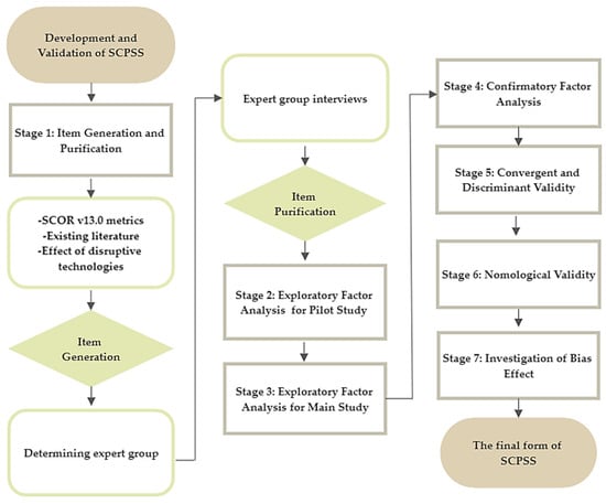 This study designed a seven-stage model to measure, validate, and constitute the structure and predictability of SCP. Stage 1 focused on item generation and purification. In Stage 2, a draft questionnaire was made up, the pilot study was performed, and the item pool was finalized for the main study. In Stage 3, exploratory factor analysis (EFA) was executed by compressing five factors to perform SCOR v13.0-based dimensionality, and the initial determination of dimensionality was performed. Confirmatory factor analysis (CFA) was carried out performing confirmation of dimensionality in Stage 4. While convergent and discriminant validity appraisal was executed in Stage 5, nomological validity was evaluated in Stage 6. Bias effect was investigated in Stage 7. The macro view of the research process is illustrated in Figure 1 below: