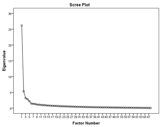 The eigenvalue indicates the amount of information obtained from a factor. According to the eigenvalue rule, factors with an eigenvalue lower than 1.0 should not be considered []. The scree plot is based on eigenvalues and supports deciding the correct number of factors. The change in eigenvalue for successive factors is taken into consideration, while investigating this graph []. Figure 2 gives information about the eigenvalues for the factor structures. This value is 27.00 for a single factor structure and 3.00 for a three-factor structure approximately. Since the study is based on SCOR v13.0, it was compressed into five factors due to its theoretical background. The eigenvalue is 2.50 for a five-factor structure approximately. The structures compressed into the five factors given in Table 2 reflect 58.436%, 60.732%, and 61.137% of the total variances, respectively. Since a flattening is seen in the graph after the fifth factor in the scree plot, it is possible to say that the data point to the five-factor structure.
