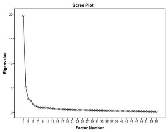EFA is a type of factor analysis that allows the correlations between observed variables to be explained by fewer latent variables or factors []. It ensures the initial definition of the sub-dimensions of the structure, or in other words, the factors [,]. The type of rotation and extraction are determined by the researcher while performing the analysis. Oblique rotation is used if sub-dimensions are highly correlated to each other [,]. Structures are usually highly correlated to each other in social sciences, so this rotation is commonly used []. In this study, the correlations between the items were investigated to understand the relationships between the structures, and since most of the correlations were above 0.30, direct oblimin, a type of oblique rotation, was utilized. Principal axis factoring, which is an effective method to reveal weak factors, was used as an extraction method [].