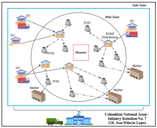 In case of an earthquake, Figure 2 shows the structure of the humanitarian chain considered in this investigation. The supplies are transferred from a supplier to the distribution centers. The supplier is the warehouse of Infantry Battalion No. 7 José Hilario López (Colombian National Army). For this study, we considered that, in the disaster aftermath, the relief supplies served all the population in need. The objective is to provide a model considering activities from the two phases. The optimal location for the distribution centers of a set of potential sites is determined in the preparation phase. The closest point to which the affected people should move is determined in the post-disaster phase.