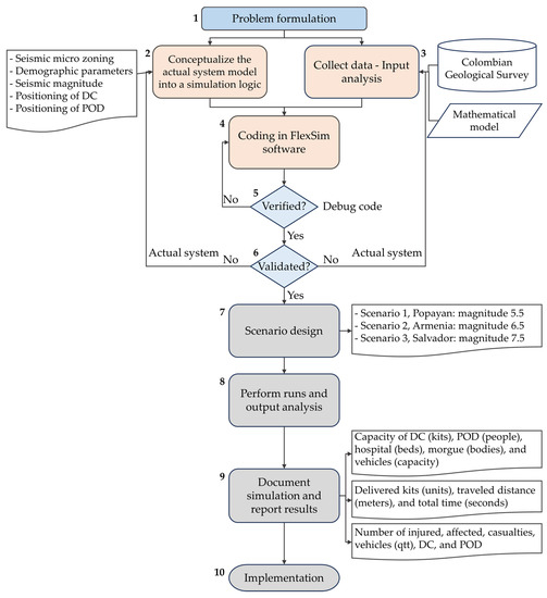 For the analysis of the scenarios and the application of the simulation model, in stage 7, cases of earthquakes in Colombia and Latin America were proposed. In stage 8, the scenarios’ executions and subsequent analyses were used to estimate the performance measures. Based on the analysis of the executions in step 9, it was determined if other executions were needed. In stage 10, the simulation model was documented to make decisions based on the analysis. Fourteen variants were determined and obtained.