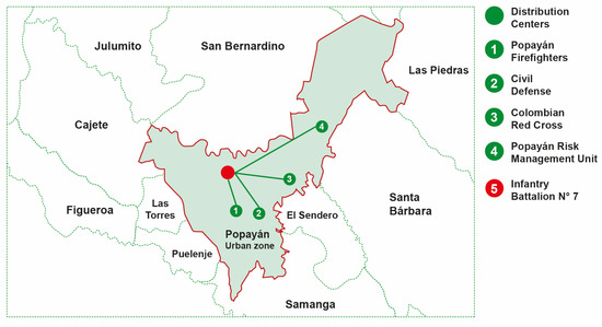 In a disaster, the humanitarian logistics chain must react immediately and provide the best assistance to affected people (see Figure 4 for the location of distribution centers). The model proposed in this article is designed to serve 1000 families from 12 neighborhoods in communes 1 and 2 of Popayan, with a response time of 92 min to deliver 2000 H.A.E. kits.