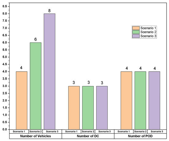 Simulations were carried out for 14 defined variants. Each variant had 30 repetitions, mainly for variants 9, 10, and 11, in different random samples for the respective distributions. Figure 5 identifies the number of vehicles used, D.C., and P.O.D. in each simulated scenario.