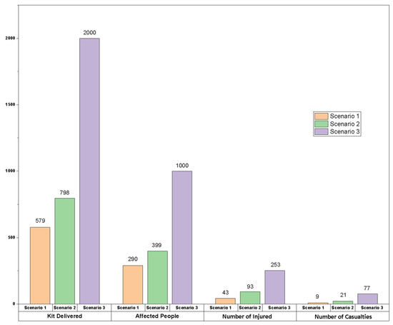 This article focuses on evaluating the sensitivity of the solution, which means an evaluation of the viability of humanitarian aid operations in the event of an earthquake at different magnitudes on the Richter scale. Figure 6 presents the number of affected, injured, and casualties.