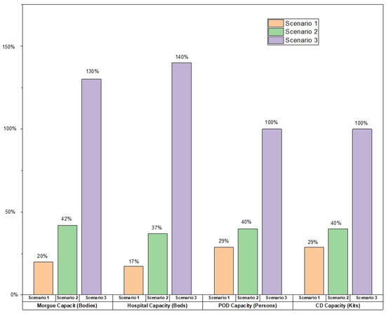 Another characteristic was the evaluation of the utilization of the installation’s capacity. Figure 7 shows the occupancy values for distribution centers, shelters, hospitals, and morgues.