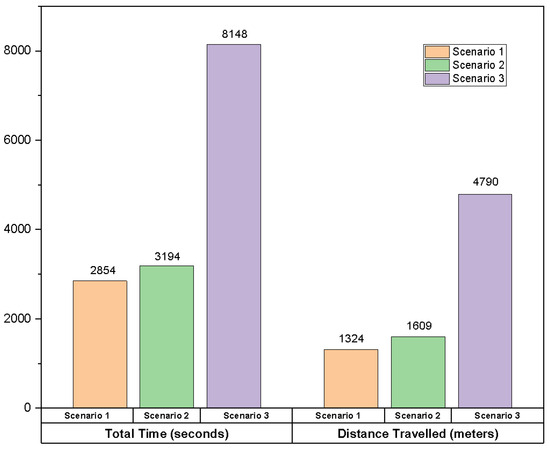 This research is limited to examining the previous characteristics because they were considered representative to evaluate the elasticity and sensitivity in humanitarian logistics to parameter changes. This model allows evaluation of the goodness of the solution returned for the formulated decision problem. As shown in Figure 8, the experiments, deterministic variants with the same intensity of affectation, allow the implementation of the aid plan in 2.4 h and travel a distance of 21.28 km for the most critical scenario evaluated.
