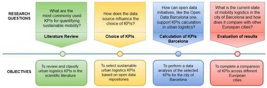 The research questions and the objectives for each stage of the present study are shown in Figure 1. Thus, the following research questions are formulated: (i) what are the most commonly used KPIs for quantifying sustainable mobility?; (ii) how does the data source influence the choice of KPIs?; (iii) how can open data initiatives, like Open Data Barcelona, support KPIs calculation in urban logistics?; and (iv) what is the current state of mobility logistics in the city of Barcelona and how does it compare with other Euroepan cities? Likewise, the associated specific goals are as follows: (i) to review and classify urban logistics KPIs in the scientific literature; (ii) to select sustainable urban logistics KPIs based on open data repositories; (iii) to perform a data analysis of the selected KPIs for the city of Barcelona; and (iv) to complete a comparison of KPIs across different European cities.