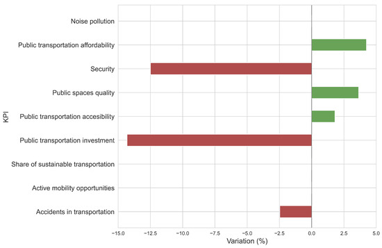 Concerning Barcelona, the principal KPIs indicating a high level of quality included “public transportation accessibility”, “transportation accidents”, “greenhouse gas emissions from transportation activities”, “affordability of public transportation”, “percentage of sustainable transportation”, and “investment in public transportation”. Similarly, areas requiring improvement—the focus of urban policies—were identified. These encompassed “traffic congestion”, “NO emissions”, “PM emissions”, “PM emissions”, and “noise pollution”. Therefore, higher values in these indicators were preferable, representing the primary objectives. The distinguished high-quality KPIs underscored the strengths of Barcelona, while other areas necessitating enhancements were identified as well.