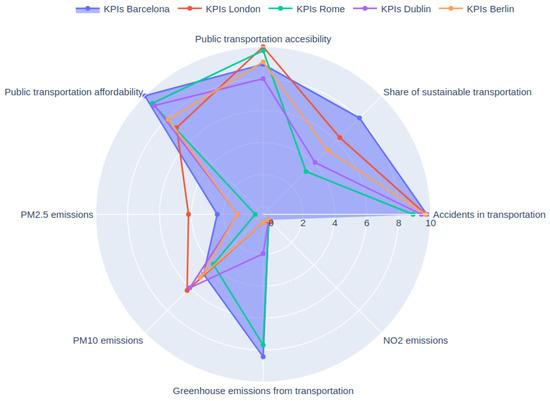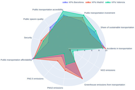 One of the motivations behind selecting the aforementioned KPIs and employing a scale of 0 to 10 is to facilitate cross-city comparisons with other European urban areas offering similar data. This approach allows for providing tailored recommendations to policymakers in each city based on their respective baseline results. However, while exploring open data about other European cities, two primary challenges were encountered: data availability and data currency. Specifically, not all data are regularly updated, and not all city websites grant access to the information necessary for calculating the KPIs. Figure 5 compares three of the largest Spanish cities: Barcelona, Madrid, and Valencia. Likewise, Figure 6 offers a comparison with several European cities: Barcelona, London, Rome, Dublin, and Berlin. The selection of these cities was made based on the existence of available open data.
