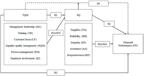 As can be noticed in Table 1, some studies mainly investigated the relationships between TQM and SQ [12,17,30], while other studies focused on the relationship between SQ and FP [27,42] and a few studies explored the association between TQM and FP [8,31,41]. However, to the best of authors’ knowledge, no studies have investigated the three constructs together. As a result, the following conceptual framework has been developed to fill the gap in the literature, as shown in Figure 1.
