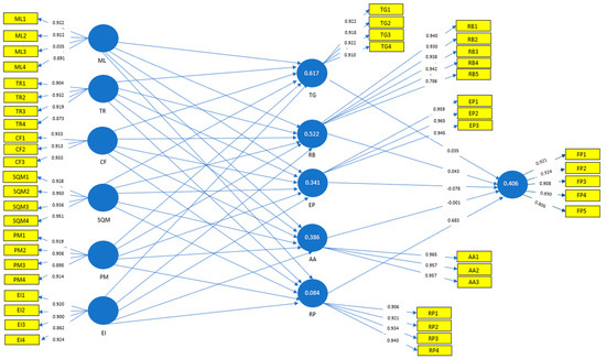 Hypothesis 1 proposed that TQM positively influences SQ. The findings of this study show that TQM positively and significantly affects SQ (β = 0.699, p = 0.000). Hence, H1 is accepted. H2 proposed that SQ positively influences FP. The results reveal that SQ has a positive and significant effect on FP (β = 0.397, p = 0.010). Stepwise regression is a statistical technique employed to ascertain and choose the most pertinent independent variables that account for the variability observed in a dependent variable [46]. In this study, stepwise regression analysis provided empirical evidence supporting the statistical significance of the association between SQ and FP (β = 0.354, p = 0.001). H3 proposed that TQM has a positive and significant impact on FP, but the results showed that TQM has no significant impact on FP. Table 8 summarizes the results of the structural equation modeling.