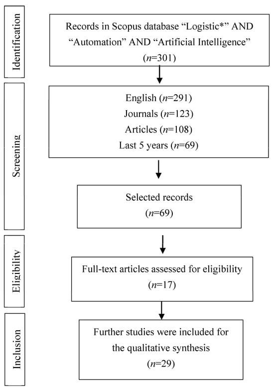 Figure 1 presents the initial pool of 301 manuscripts identified during the identification phase. To ensure the inclusion of the highest quality articles, we applied a series of filters in the review process. Initially, we excluded non-English manuscripts, as English is widely recognized as the universal language of scientific research, resulting in 291 remaining manuscripts. Next, we applied the “Journal” filter, narrowing the results down to 123 manuscripts. Further refining the selection, we applied the “articles” filter, which left us with 108 articles that met our criteria for high-quality studies. To capture the most recent and relevant contributions to the field of logistics and automation, we applied a time filter, considering only articles published between 2019 and 2023. This five-year timeframe was chosen because it coincided with a notable upsurge in published articles in this area. Throughout the eligibility phase, we examined all chosen manuscripts, subsequently excluding 52 articles inaccessible to us, resulting in a final selection of 17 articles. Although the initial search was conducted solely through Scopus, we recognized the importance of including other articles that offered relevant contributions to our study. Consequently, the search was expanded to 12 additional articles, resulting in a final set of 29 reviews that met our stringent criteria for inclusion. The application of these filters and the inclusion of relevant articles allowed us to focus on a select group of high-quality studies, providing a comprehensive foundation for our review on the topic of logistics and automation.