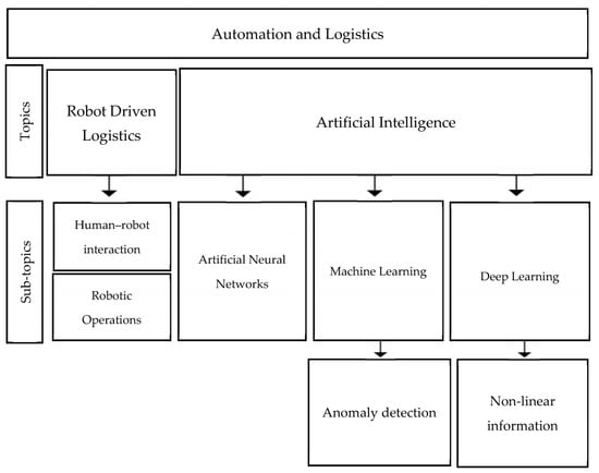 Intelligent systems have significantly transformed the logistics landscape, primarily through the adoption of automation, which has proven effective in mitigating failure and accidents []. Artificial intelligence (AI) has emerged as a reliable and cost-effective solution, empowering businesses to address uncertainty and efficiently manage complex algorithms []. While automation has been extensively studied in computer science [], engineering [], mathematics [], and medicine [], logistics in scientific research still falls short when compared with these domains. To justify our previous argument, we conducted a search on the Scopus database during the final quarter of 2023. Employing the search term “artificial intelligence” in the title, abstract, and keywords, we observed substantial representation in various academic disciplines. Specifically, the field of computer sciences demonstrated the highest prevalence at 37%, followed by engineering at 16.4%, mathematics at 14%, and medicine at 5.4%. When restricting the analysis to the most recent five-year period, a slight shift becomes apparent. During this timeframe, the representation of “artificial intelligence” in the field of computer science amounts to 28.3%, followed by engineering at 16.2%, medicine at 8.9%, and mathematics at 8.7%. In contrast, the occurrence of “artificial intelligence” within disciplines such as materials science and management was comparatively minimal, accounting for 2.1% and 1.8%, respectively. In the last 5 years, materials science has presented 3% and management has been around 2%. Furthermore, we expanded our investigation by incorporating dual search terms with no time restriction. The combination of “artificial intelligence” and “engineering” yielded 45,050 manuscripts, while “artificial intelligence” and “computer sciences” resulted in 38,234 manuscripts. Similarly, the search pairing “artificial intelligence” with “medicine” generated 13,394 manuscripts, whereas the intersection of “artificial intelligence” and “logistics” produced a relatively modest 7,333 manuscripts. Some notable studies, such as Woschank et al. [] research on AI in smart logistics and Iyer et al. [] work on intelligent transportation, have shed light on this issue. “Smart logistics” encompasses the application of advanced technologies [], data analysis [], and automation [] in the logistics domain, aiming to optimize supply chain processes []. This integration involves interconnected systems and devices enabling real-time monitoring, analysis, and decision making in logistics operations [] By utilizing automation and digital technologies, smart logistics strives to enhance supply chain performance, visibility, and responsiveness, resulting in improved productivity, cost efficiency, and heightened customer satisfaction []. Automation facilitates this transformation by enabling intelligent decision-making algorithms and machine learning models that optimize routing, scheduling, and final delivery, thereby ensuring efficient resource allocation, cost reduction, and timely delivery of goods []. Overall, the incorporation of automation in logistics plays a pivotal role in the evolution of conventional supply chains into intelligent, interconnected, data-driven systems [] that underpin the concept of smart logistics. In this context, several articles delve into the potential applications of cutting-edge technologies, such as the AR/VR (augmented reality/virtual reality) technologies within Industry 4.0. In that regard, articles such Machała et al. [] examine the integration of smart glasses and mobile devices to facilitate augmented reality experiences, thereby expediting work processes and data transfers in developed nations’ manufacturing, warehousing, and transportation sectors. It is important to note that this is a single instance illustrating the broader scope of possibilities within this domain.