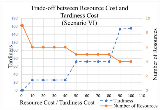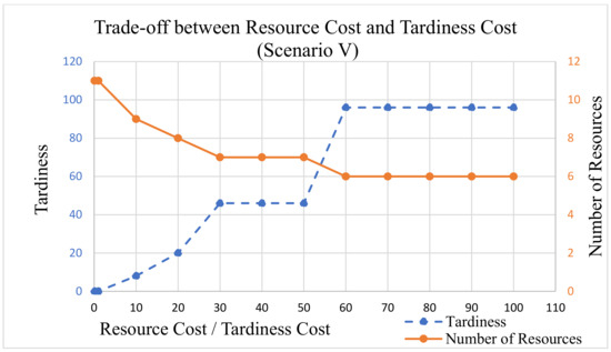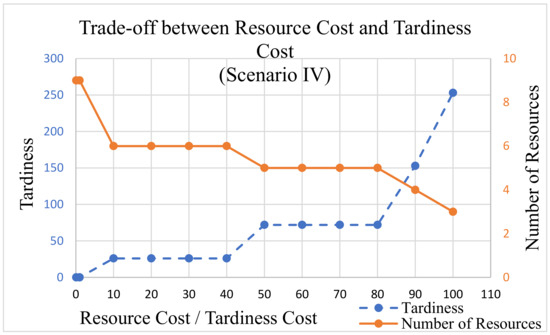 For example, for Scenario IV at ratios between 0 and less than or equal to 1, shown in Figure 11, the number of resources stays constant at 9 and the total tardiness stays at 0. At the ratio of 10, the number of resources decreases to 6 and tardiness increases to 26. The number of resources and tardiness stays unchanged at ratios of 20, 30, and 40. At the ratio of 50, the number of resources decreases to 5 and tardiness increases to 72. The number of resources and tardiness stays unchanged at ratios of 60, 70, and 80. At the ratio of 90, the number of resources decreases to 4 and tardiness increases to 153. At the ratio of 100, the number of resources decreases to its lowest level, which is 3, and tardiness increases to 253.