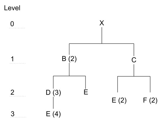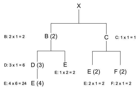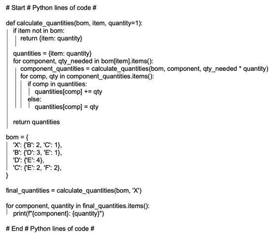 As mentioned earlier, a BOM is an exhaustive list of all materials, components, subassemblies, and their corresponding quantities required to manufacture a given product (Figure 2). In manufacturing, particularly in sectors such as the automotive industry, production efficiency depends on BOM oversight. This implies vigilant monitoring of BOM components and their availability throughout the production continuum, ensuring compliance with production deadlines and preventing potential problems related to shortages. In this regard, Python can be leveraged as a powerful tool for BOM oversight. Python’s versatile capabilities can be harnessed to guarantee the accessibility of essential components and harmonize their synchronization with production schedules. For example, Python can be used to create scripts (the Python script below as an example) or software tools that automatically synchronize the BOM with production schedules. This ensures that the materials and components needed for each production phase are available on time, mitigating delays and bottlenecks. Additionally, Python can be integrated with various data sources and sensors to enable real-time monitoring of the status of materials and components. This provides manufacturers with timely updates on inventory levels, usage trends, and potential shortages. By capitalizing on Python’s capabilities, manufacturers can obtain a comprehensive and up-to-date understanding of their BOMs, which can lead to improved operational efficiency, productivity, and profitability. To provide a clear industrial example, we used a simple instance from Stevenson [8]. This simple example illustrates the bill of materials (BOM) for product X, which requires the calculation of the quantities of components B, C, D, E, and F needed to assemble a single unit of X.