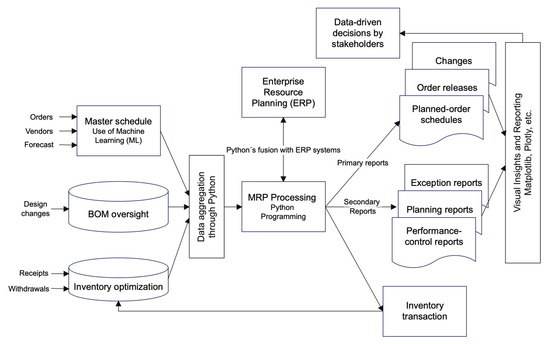 In Figure 5, we provide an overview of the key concepts discussed in Section 4. The below figure visually incorporates the transformation of the conceptual model depicted in Figure 1 into a practical Python implementation, seamlessly integrated with the ERP systems. As previously highlighted, Python empowers the integration of innovative techniques for information retrieval and data aggregation. This, in turn, leads to highly efficient data manipulation, analysis, and optimization, all of which significantly enhance the MRP (Materials Requirement Planning) processes. Additionally, the Python’s capabilities facilitate the generation of both primary and secondary reports, offering insightful visualizations that empower stakeholders to make well-informed decisions.