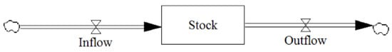 While stocks and flows are essential elements for creating dynamic phenomena, they do not encompass the entirety of system dynamics. To provide a more accurate explanation, it is crucial to understand that in real-world systems, stocks and flows interact within feedback loops. These feedback loops may comprise various types of feedback mechanisms and occasionally feature nonlinear connections, leading to unexpected and counterintuitive behaviors [26]. Figure 2 illustrates a straightforward stock–flow system including feedback, illustrating the connection between a stock and its inflow.