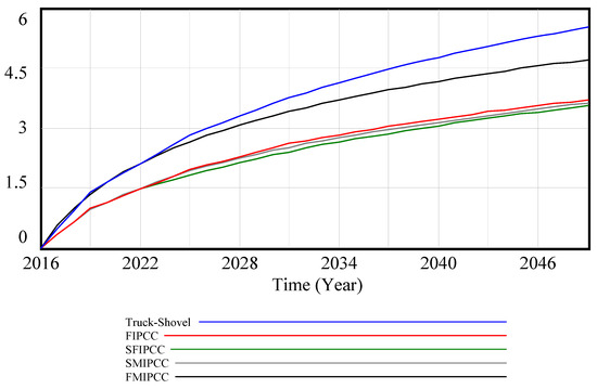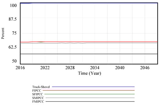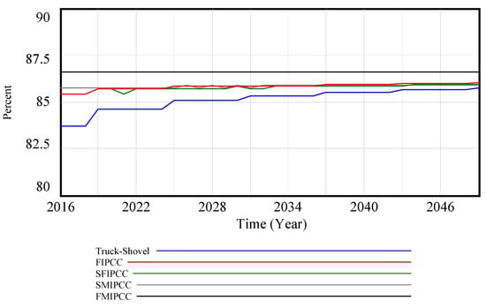 Unlike the FMIPCC system, the Truck–Shovel system exhibits lower system utilization, standing at 86.6%. This is primarily attributed to the greater number of trucks, leading to increased stoppage times. Nevertheless, boosting the truck count is expected to raise the average system utilization from 83.7% in 2016 to 85.72% in 2049 (Figure 4). FIPCC, SFIPCC, and SMIPCC systems exhibit closely aligned values, though, in certain intervals, one may indicate higher system utilization compared to the other two.