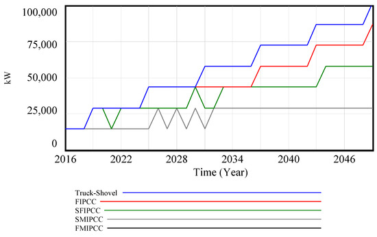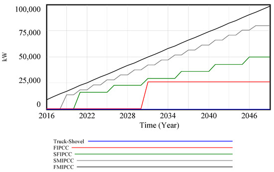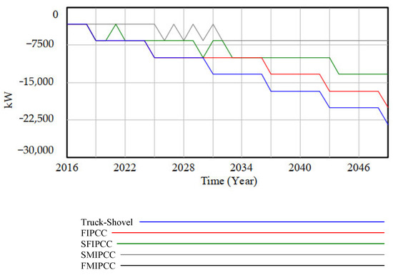 In comparison to the Truck–Shovel system, which stands out for its substantial consumption of loaded truck power, the FMIPCC system exhibits a clear advantage with zero truck power consumption. This disparity is primarily due to the absence of trucks within the FMIPCC system, as illustrated in Figure 6. Moreover, it is clear that extending the transportation route for moving ore from mining sites to the crusher leads to an increased requirement for truck power. The logic here is straightforward: systems employing a greater number of trucks in their operations inherently incur higher power consumption. In the hierarchy of power consumption, the Truck–Shovel system takes the lead, followed by the FIPCC system, the SFIPCC system, the SFIPCC system, and the SMIPCC system, in sequential order.