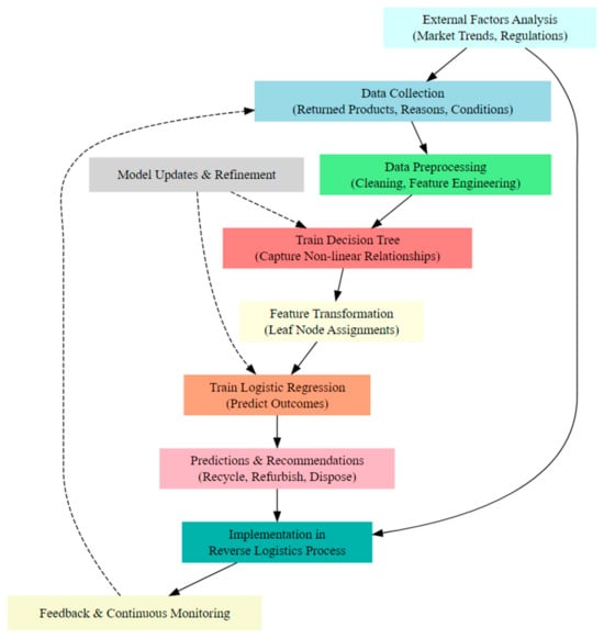 Against this backdrop, this paper introduces an integrated methodology that synergizes binary logistic regression with decision trees. Binary logistic regression has been widely used to predict binary outcomes based on categorical or binary predictors, offering insights into the relationship between predictors and optimization outcomes [50,51]. Additionally, decision trees have been employed to capture complex patterns and interactions among predictors, providing a comprehensive understanding of decision-making processes [52,53,54]. However, the standalone use of binary logistic regression or decision trees may not fully capture the intricacies of reverse logistics optimization in the Industry 5.0 context. Binary logistic regression may struggle to account for nonlinear relationships among predictors, while decision trees might encounter challenges such as overfitting or limited interpretability. To overcome these limitations and provide a comprehensive framework for predicting and optimizing reverse logistics flows and networks within the Industry 5.0 landscape, the proposed methodology combines binary logistic regression and decision trees in order to harness the strengths of both methods and offer a robust and interpretable framework for researchers and practitioners aiming to enhance reverse logistics practices in the Industry 5.0 era.