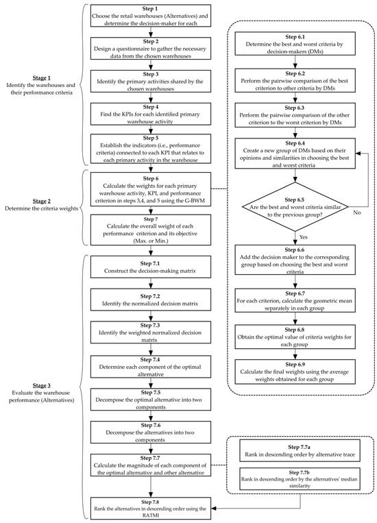 In this paper, two combined MCDM techniques, comprising the G-BWM technique, were used to group the criteria and give weights to each one. The RATMI technique ranks the alternatives based on the weight given by the G-BWM. The G-BWM allows for group decision-making in determining the criteria weights. Since the evaluations involve subjectivity from multiple warehouse experts, using their collective judgments through G-BWM provides a more democratic weighting process. The RATMI enables a comprehensive ranking of the warehouse alternatives based on the weighted performance scores across all criteria. This helps to systematically produce an overall performance evaluation and ranking. Combining both techniques allows them to complement each other. The G-BWM provides the weights as input for the RATMI, which then uses those weights to generate the final ranking. This makes the evaluation more robust by leveraging the strengths of both methods. Both the G-BWM and the RATMI have been validated in previous studies for effectiveness in group MCDM problems. Applying them together extends their combined application to the warehouse performance evaluation context. The combination approach addresses the limitations of the individual techniques and provides the cross-validation of the results through the convergence of the two methods on a common solution or ranking. This enhances the reliability of findings. In summary, the researchers chose a combined G-BWM and RATMI approach to leverage their synergies, produce a rigorous yet democratic weighting process, and generate a validated overall performance ranking for strategic decision-making. This research aimed to contribute to the existing literature by filling the research gap and providing decision-makers and warehouse managers with a more robust and integrated method for evaluating retail warehouse performance. By addressing the need for a systematic ranking mechanism and considering multiple performance criteria, this study offers a novel perspective that enhances the understanding of warehouse effectiveness and supports data-driven decision-making in the retail sector.