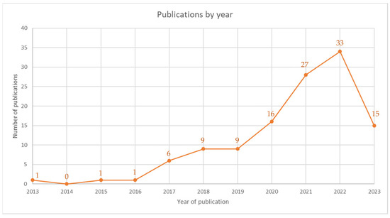 The frequency of papers published on the topic is illustrated in Figure 3. No lower limit on publication date is set and the one paper published in 2013 is the first one matching the search criteria. The paper published in 2013 is on the topic of the Internet of Things and analyzes how IoT in combination with cloud computing could be key to handling large amounts of data in the future [26]. The next publication is from 2015 and is highly relevant as it considers IoT in a warehouse setting [27]. Although IoT and IIoT are considered key technological components of the fourth industrial revolution, the term “Industry 4.0” was not used in any publication in the search until 2016. Thereafter, the number of publications increases steadily until 2019, from which point onwards there is a greater growth until 2022. Although the publication amount in 2023 is on the same level as it was before the sharp increase in 2019, this number can be expected to be higher by the end of the year considering the publication trends.
