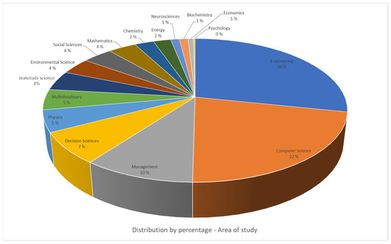The nature of this study is such that it covers many areas of study. “IIoT and technologies in warehousing and logistics” is a broad topic, and studies into it can cover areas like engineering, sociology, computer science, and many more. To gain an overview of the encompassing topics for all articles, a distribution percentage from the results is derived. Some of the articles fall under several of these study areas, and this is taken into consideration in the overview. The distribution is shown in Figure 4.