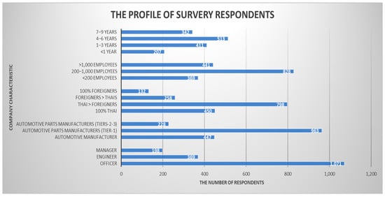 The population data showed that years of work experience are as follows: 5–10 years—513 (31.3%) and 1–3 years—411 (25.1%). Company sizes are 200–1000 employees—828 (50.5%) and more than 1000 employees—441 (50.5%). For company shareholders’ nationality, Thais hold more shares than foreigners—798 (48.7%), and there were 450 Thai 100% shareholders (27.5%). For type of business, automotive parts manufacturers represent (Tier-1) 963 (58.8%), and automotive manufacturers represent 447 (27.3%). In terms of job position, there are 1071 employees (65.4%) and 369 engineers (22.5%), as presented in Table 2 and Figure 1.