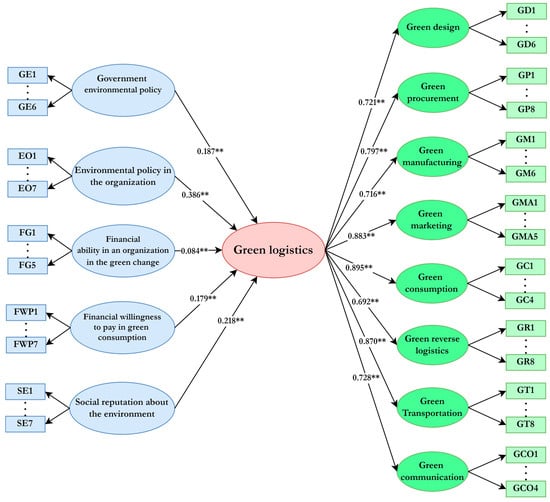Lastly, for Hypothesis 5—financial willingness to pay for green consumption positively affects green logistics, we found that the standardized path coefficient value is γ = 0.179. The observed influence of the social reputation for environmental concerns regarding green logistics management is in harmony with previous studies underscoring the impact of participation in environmental public relations, engagement in government-led educational initiatives, contributions to environmental conservation, and the conduct of organizational environmental assessments as contributors to green logistics operations in accordance with organizational social responsibilities. These findings are similar to those of [58,59].