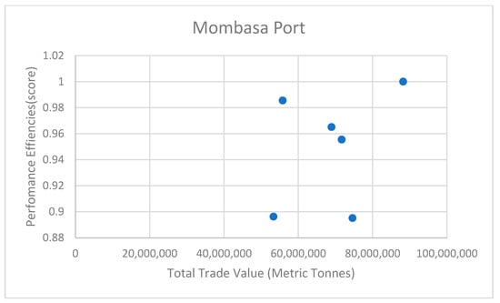 The integration of contextual variables through CVA introduced external trade levels as a factor influencing port performance. This contextual perspective shed light on the interplay between trade dynamics and port efficiency. Importantly, countries using both ports exhibited an increasing trend in total trade over the years. Countries that used Dar es Salaam Port saw a total trade growth from 230 million metric tons in 2016 to 260 million metric tons in 2021, and countries using Mombasa Port saw the total trade rising from 250 million metric tons in 2016 to 270 million metric tons in 2021. Furthermore, Pearson’s and Spearman’s correlations highlighted positive yet weak relationships between efficiency and total trade levels for both ports, with correlation coefficients of approximately 0.35 and 0.38, respectively.