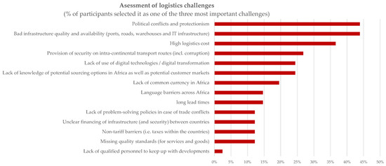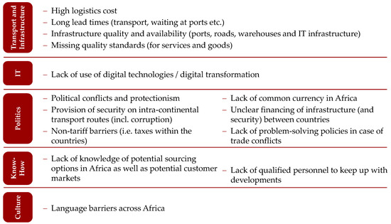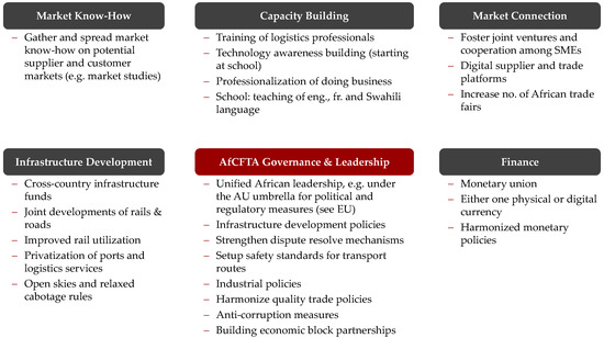 From the perspective of governmental institutions, the results of the study have various implications that are in line with current developments, which are currently being strongly promoted by the AU and others. Participating companies in this study have once again emphasized that a great deal of support is needed from governments to be able to exploit the potential of African free trade. Clear AfCFTA governance is needed, and it affects various levels. It is important for governmental institutions at the national and, above all, continental levels to understand that the requirements of the industry must be regularly included in the decision-making process so that actions initiated on the governmental level do not bypass the reality of companies operating between African countries. Among other things, this is important for the development of intra-African logistics corridors, which are currently being strongly promoted [36,37]. Only when this issue is addressed with the help of an integrative approach from politics and industry, and with the support of research institutions, will the right infrastructure investments be made, which can then also provide the missing boost for the AfCFTA.