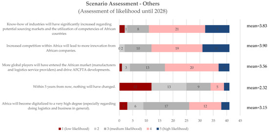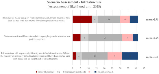 Through the expert panel, 21 potential development scenarios for future supply chains emerging from the AfCFTA have been developed and assessed through the post-workshop questionnaire to contribute to the discussion about potential future developments in this field (RO3). The 21 development paths are synthesized statements from the brainwriting process done with practitioners of the group exercise. Participants in the post-workshop survey were then asked to rate, on a scale of 1 (low likelihood) to 5 (high likelihood), how realistic it is that this statement will become true within the next five years, i.e., by 2028. The evaluation of the results is shown in Figure 5, Figure 6, Figure 7, Figure 8 and Figure 9. The statements are divided into five categories to present the developments in the following five areas in an easily accessible way: (1) infrastructure, (2) transport and logistics networks, (3) trade, (4) politics, and (5) others. However, this categorization is only to present the statements and assessment of development paths in a structured manner. Those categories were not given to the participants when crafting their statements. For each category, a figure is displayed that shows the synthesized statements on potential developments on the left and the distribution of answers (low likelihood to high likelihood of becoming true until 2028) of 41 participants on the right side of the figure.