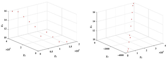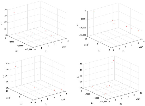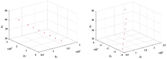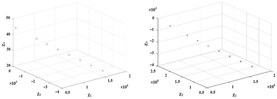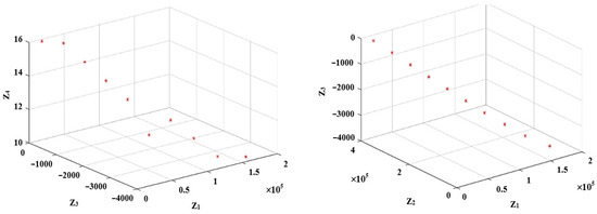 Next, taking into account the values in Table 5 and choosing , Equation (59) is employed to derive the values of for each objective function. Doing so and using the -constraint model in Equation (57), the Pareto solutions are extracted, as shown in Table 6. It is notable that in this table, the duplicate values for different values of have been removed. Also, Figure 2, Figure 3 and Figure 4 include triple combinations of the objective functions to make it possible to display them in 3D spaces.