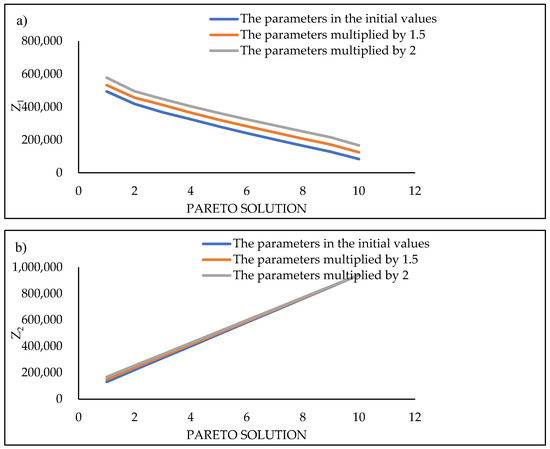 We also carry out a sensitivity analysis on the demand and the number of returned products. For this purpose, three levels are considered; (1) the parameters in the initial values, (2) the parameters multiplied by 1.5, and (3) the parameters multiplied by 2. Figure 5 shows the effects of objective functions versus the changes in the parameters represented by the demand and returned products of the supply chain. The trends of changes indicate the positive and direct effects of demand on all objective functions. However, the effects are more severe on the cost objective function than others. Nevertheless, n an uncertain business environment, the effects of changes in the demand and returned products could be of practical value. That is, if the supply chain and the business context do not have the necessary flexibility to change facilities when these parameters fluctuate, other sustainability goals are diminished inevitably. Therefore, agility and flexibility are strategies that strengthen the supply chain toward sustainability.