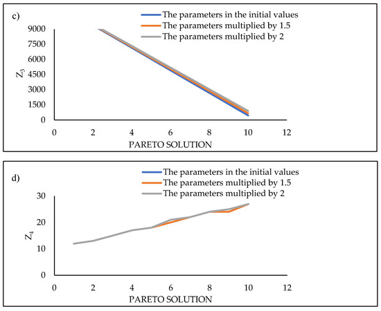 The effects of demand changes on the objective functions, where sub-figures (a–d) show those effects on the objective functions Z1, Z2, Z3, and Z4, respectively.