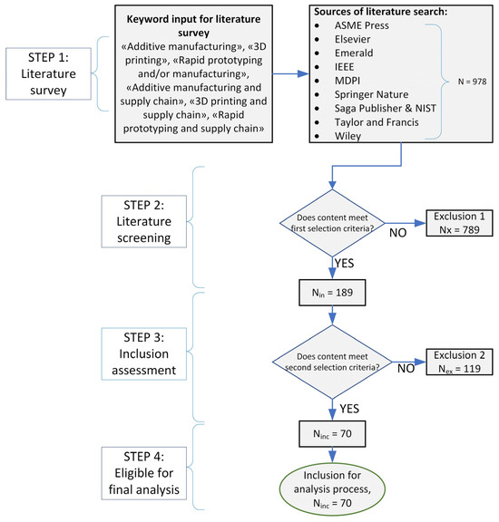 To search for the published studies, to recover as many documents as possible, and to ensure the most comprehensive coverage, publications that appeared in renowned databases like Elsevier (Amsterdam, The Netherlands), Taylor and Francis (Abingdon, UK), Emerald (Leeds, UK), IEEE (New York, NY, USA), Wiley (Hoboken, NJ, USA), Springer (New York, NY, USA), ASME (New York, NY, USA), MDPI (Basel, Switzerland), Springer, Sage (Thousand Oaks, MA, USA), and NIST (Gaithersburg, MD, USA) were used. To retrieve conference papers, journal articles, literature reviews, and book chapters from these data bases or publishers, keywords “additive manufacturing”, “3D printing”, “rapid prototyping and/or manufacturing”, “additive manufacturing and supply chain”, “3D printing and supply chain”, and “Rapid manufacturing and supply chain” were used. These keywords were used to find and include all relevant articles covering AM and SCs. Through searching the data bases, 978 papers were retrieved that focused on AM and SC-related factors and were further screened, as illustrated in Figure 1.