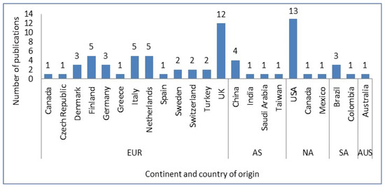The screened and reviewed articles were also mapped into categories in terms of their country of origin and continent, and the results are reported in Figure 2. For studying the country of origin, the first author’s location was utilized for the analysis, which was based on the occurrence of frequency to maintain uniformity across all recognized entries. The findings indicated that the attention given region-wise varies from continent to continent. Among the reviewed papers, the record shows that 61% (43 in number) were published in Europe (EUR), 21% (15) in North America (NA), followed by Asia (AS) at 10% (7), from South America (SA) it was 6% (4), and Australia (AUS) was 1% (1). The top six countries that contributed their results, published in 43 papers within the fields of AM and SCs, are from Europe, namely, the UK with 28% (12 papers), and the Netherlands, Italy, and Finland with 12% each (5 papers). Germany and Denmark have 7% (3 in total) of the European contribution in these subject areas. In the research areas, the USA has the highest percentage of articles from North America (87%, 13 in total). However, when it comes to the African continent, it indicates that there has been little research done in the field of additive manufacturing in the context of supply chains.