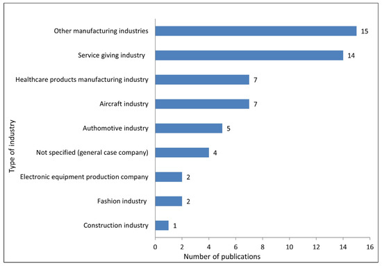 Figure 4 illustrates the publications or study areas by the types of industry, and the findings revealed that 12% (7) of the study was conducted in healthcare product manufacturing industries and aircraft industries; 9% (4) in automotive industries; on aggregate, 26% (15) of the study was conducted in other types of manufacturing industries, like cable grommet manufacturers, lamp manufacturers, pipe fitting manufacturing companies, modular and bespoke products manufacturers, notebook and smart phone industries, consumer goods, injection molding, and fuel injectors manufacturers; 4% (2) was in electronic equipment production companies and fashion industries; and on aggregate, 25% (14) of the studies were conducted in service-giving industries, including distribution agents, consumer good companies, wholesalers, retailers, and transportation and logistics service-providing sectors; and 2% (1) was in the construction sectors. This indicated that there is a lack of or limited research in the areas of construction and fashion industries, especially in footwear-making industries.