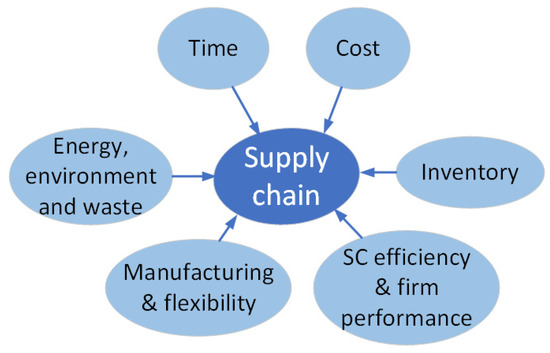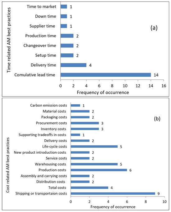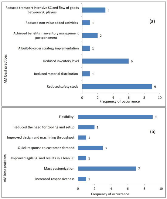 In terms of the economic feasibility of AM, the findings of our study revealed that adaptation of AM attracted the most interest in reducing delivery, setup, and changeover and production times of SCs. Among others, it breaks down SCs into the smallest components, and as a result, the system efficiency is improved by cutting down on the distribution, carrying, assembly, and component costs. It also maximizes customization and reduces the costs related to inventory holding, stock-outs, warehousing, packaging, and logistics. We also observed that the research by Mohsen [42] and Milad et al. [46] evaluated the economic feasibility of AM in terms of time- and cost-related factors, respectively. Confirming our findings, their study results illustrated the benefits of implementing AM in reducing time- and cost-related factors in SC systems.