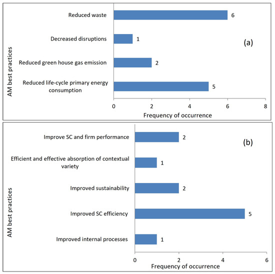 The energy, environment, and waste-related impacts of AM on SCs are other issues that are focused on in this study (Figure 7a). The results of the review, according to the frequency of occurrence in the published materials, illustrated that waste reduction scored the highest (43%), while a reduction in life-cycle energy consumption ranked in the second stage with 36% frequency, and greenhouse gas emission scored 14%, coming in at third position. Therefore, the energy, environmental, and waste-related factors of AM may have a great impact on reducing waste, energy consumption, and CO2 gas emissions.