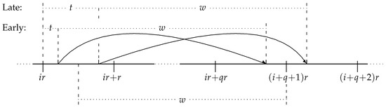 Repair orders are managed periodically, and are issued every r units of time. We denote the i’th order, , as the order issued at time . Let Jane be a random customer that arrives at time with a failed item. That is, Jane arrived t units of time into the ’s cycle. The objective of the following derivations is to compute the probability that within w units of time from Jane’s arrival (i.e., ), Jane has received a functional item. To this end, we track the demand and supply of functional items and observe that Jane will be served by if and only if at that date there is enough supply to meet the demand up to and including her arrival. The supply is S plus all the parts that were repaired on time, whereby on time we mean . Let q denote the number of complete cycles in the tolerable wait, and therefore . That is, falls either in the ’th cycle or the ’th cycle, depending on when Jane arrived during the ’th cycle.
