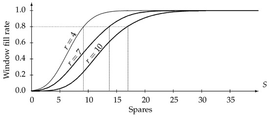 Figure 3 and Figure 4 also highlight the profound effect of the periodic review. While shorter review periods are costly in terms of order costs, they result in a higher window fill rate and therefore a need for less spare items. This, too, has been demonstrated in other models such as [37] and should be always considered by managers when they consider reducing order frequency to ordering costs. For example, if managers wish to maintain a performance level of an 80% window fill rate, then by Figure 3, in the IR model, if , then only 9 spares are needed whereas if and , then 14 and 17 spares are needed, respectively. For the OR model, by Figure 4, the numbers of spares needed are 17, 22, and 27 when , and 10, respectively.