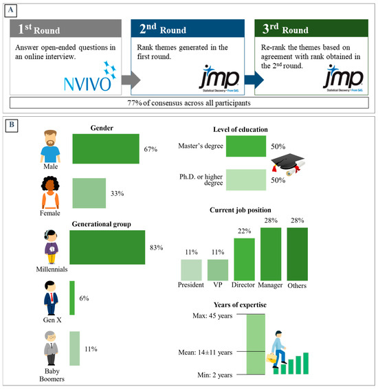 While there is no established standard for the size of the panel, a minimum of 10 experts is considered acceptable for a Delphi study [54]. In this Delphi study, 19 market experts were successfully recruited, each with well-documented socio-demographic information (Figure 2B).