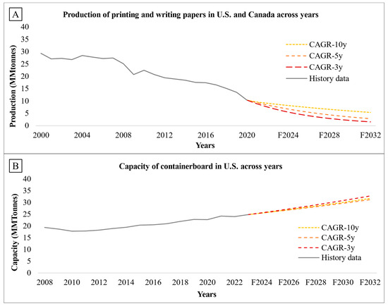 (A) Production of printing and writing papers in the United States and Canada across years [13]; (B) the capacity of containerboard production in United States across the years [30].