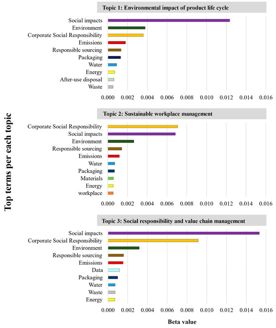 Secondly, we utilized latent Dirichlet allocation (LDA), an advanced topic modeling technique, to systematically identify the main topics present in sustainability reports published by hygiene tissue companies over the past decade. The utilization of LDA enables the extraction of themes and trends from large volumes of text data, reflecting the MCDM principle of integrating diverse data sources to enhance the comprehensiveness and reliability of the analysis.