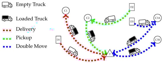 In this method, all incoming truck arrivals are associated with two distinct types of jobs: imports and exports. Export jobs are referred to as “pickup jobs”, since they require the pickup of goods from the shipper prior to travel to the terminal (to be exported). Conversely, import jobs are referred to as “delivery jobs”, since they involve the delivery of goods to the consignee after accessing the terminal. The available job types considered in the TAS are visually depicted in Figure 1. A delivery job comprises traveling to the terminal, gate clearance, loading, transport to the consignee, and unpacking, whereas a pickup job involves traveling to the shipper, packing, transport to the terminal, gate clearance, and unloading. The time cost of returning to the original depot is not factored in for either job type. It is evident from the figure that empty trucks are used for at least a portion of the transport process for both job types, resulting in a potentially higher number of trucks being required for a given set of jobs. To address this issue, a double move can be performed if a pickup and delivery job can be performed sequentially. Only cases where a delivery job follows a pickup job are considered, but not the other way around. This allows a single truck to be used for two jobs, without the need for additional transport costs.
